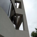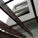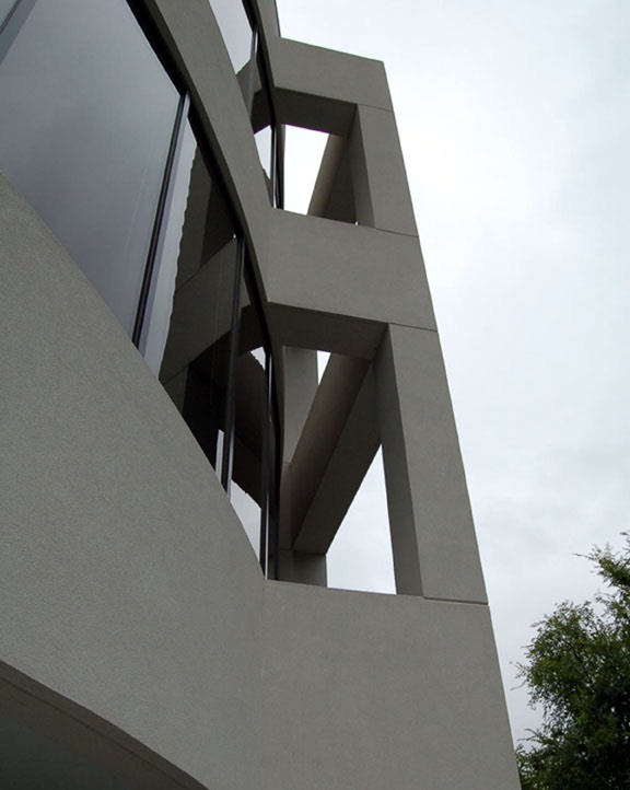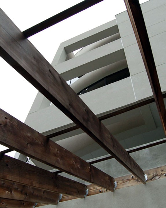 The two story building sits atop two stories of parking. The concrete garage is open to the light of the sky through the screen of the pergola, which brings the building's landscaping all the way to the parking area.
